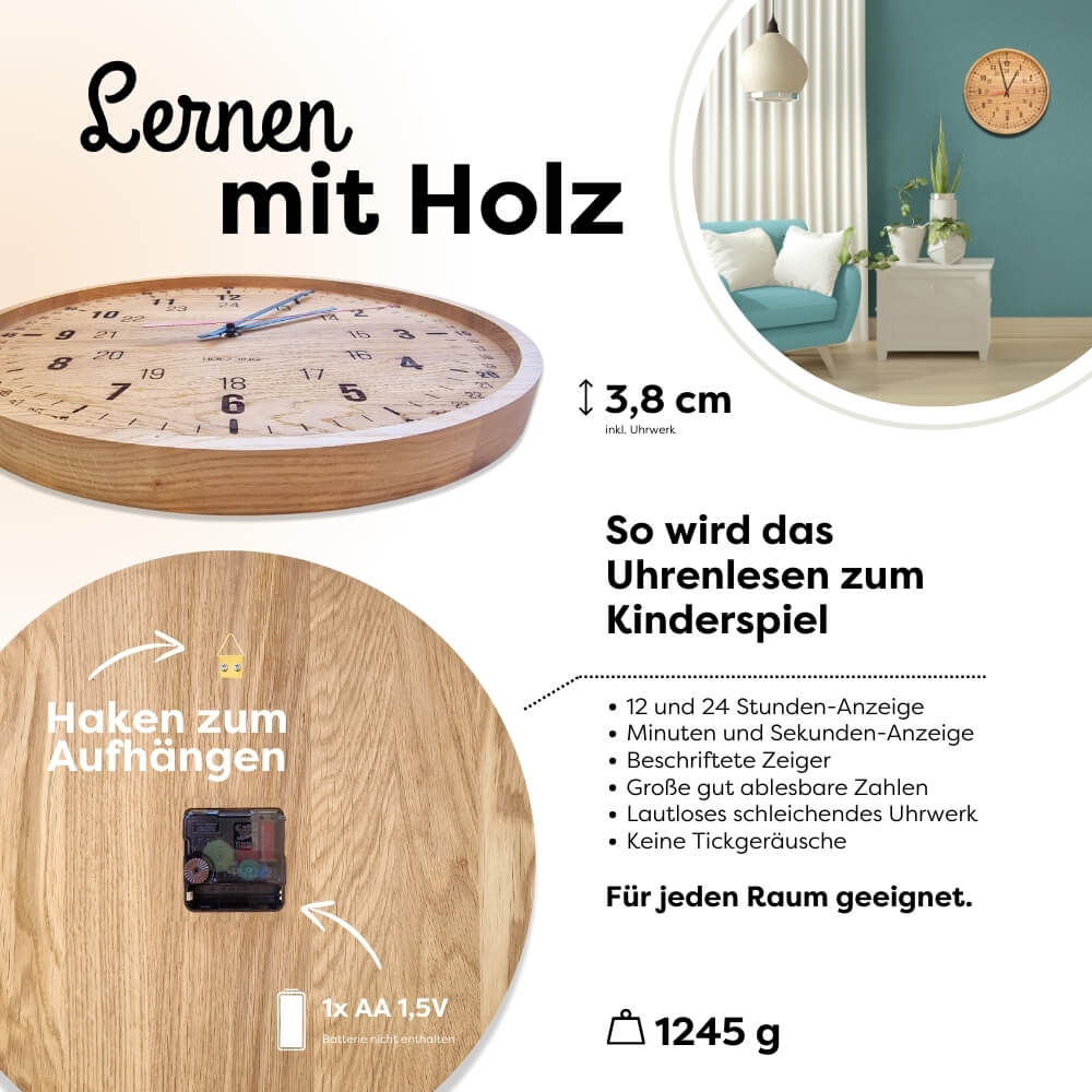 Nein, die Lern-Wanduhr eignet sich für alle Altersgruppen. Sie ist aus hochwertigem Eichenholz gefertigt und passt mit ihrem zeitlosen Design in jeden Raum, sei es im Wohnzimmer, Büro oder anderen Bereichen.